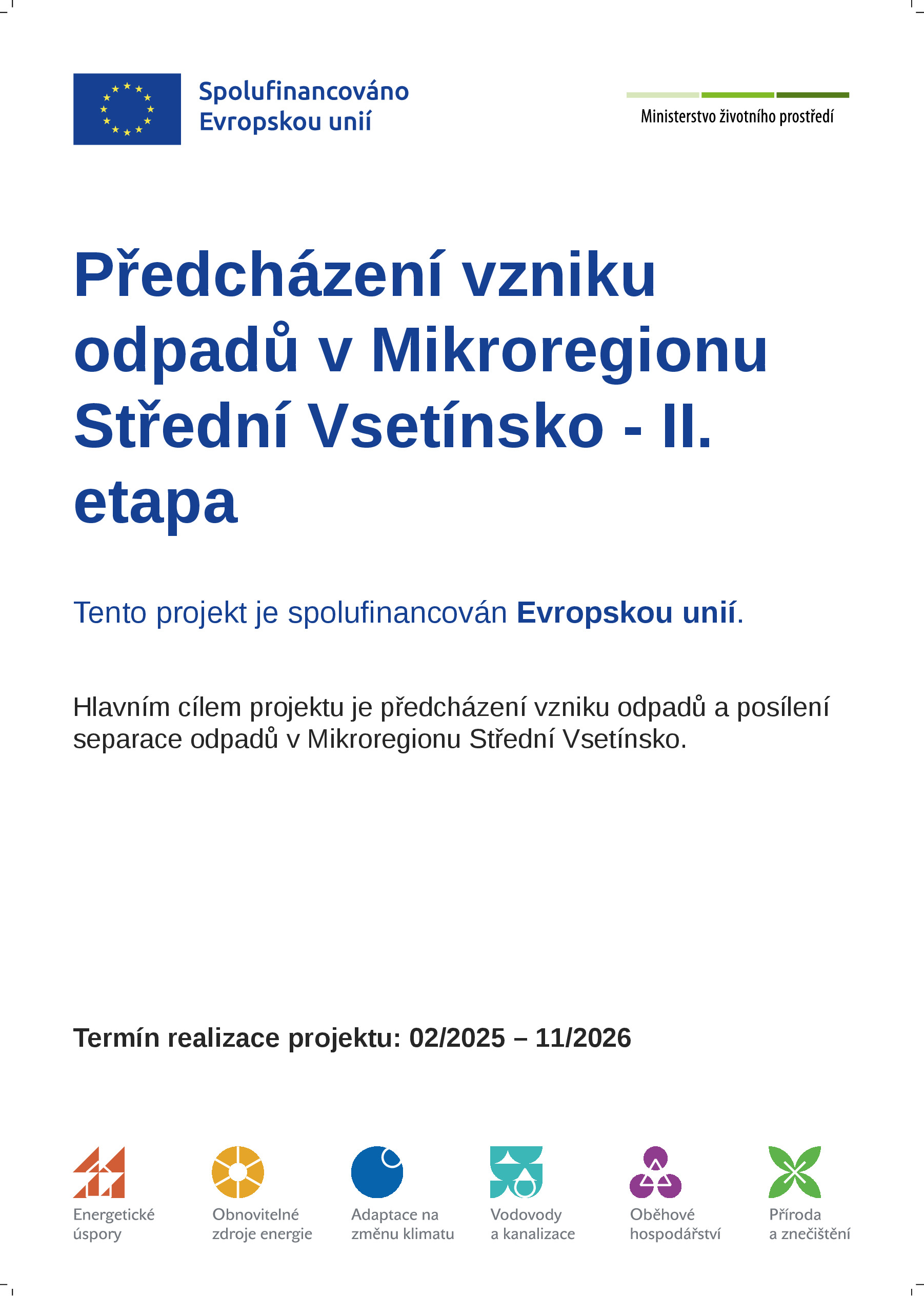 Hlavním cílem projektu Předcházení vzniku odpadů v mikroregionu Střední Vsetínsko - 2. etapa, registrační číslo CZ.05.01.05/XX/24_068/0004716 je pořízení vratného nádobí na akce pořádané mikroregionem Střední Vsetínsko. Termín realizace projektu 02/2025-12/2026.