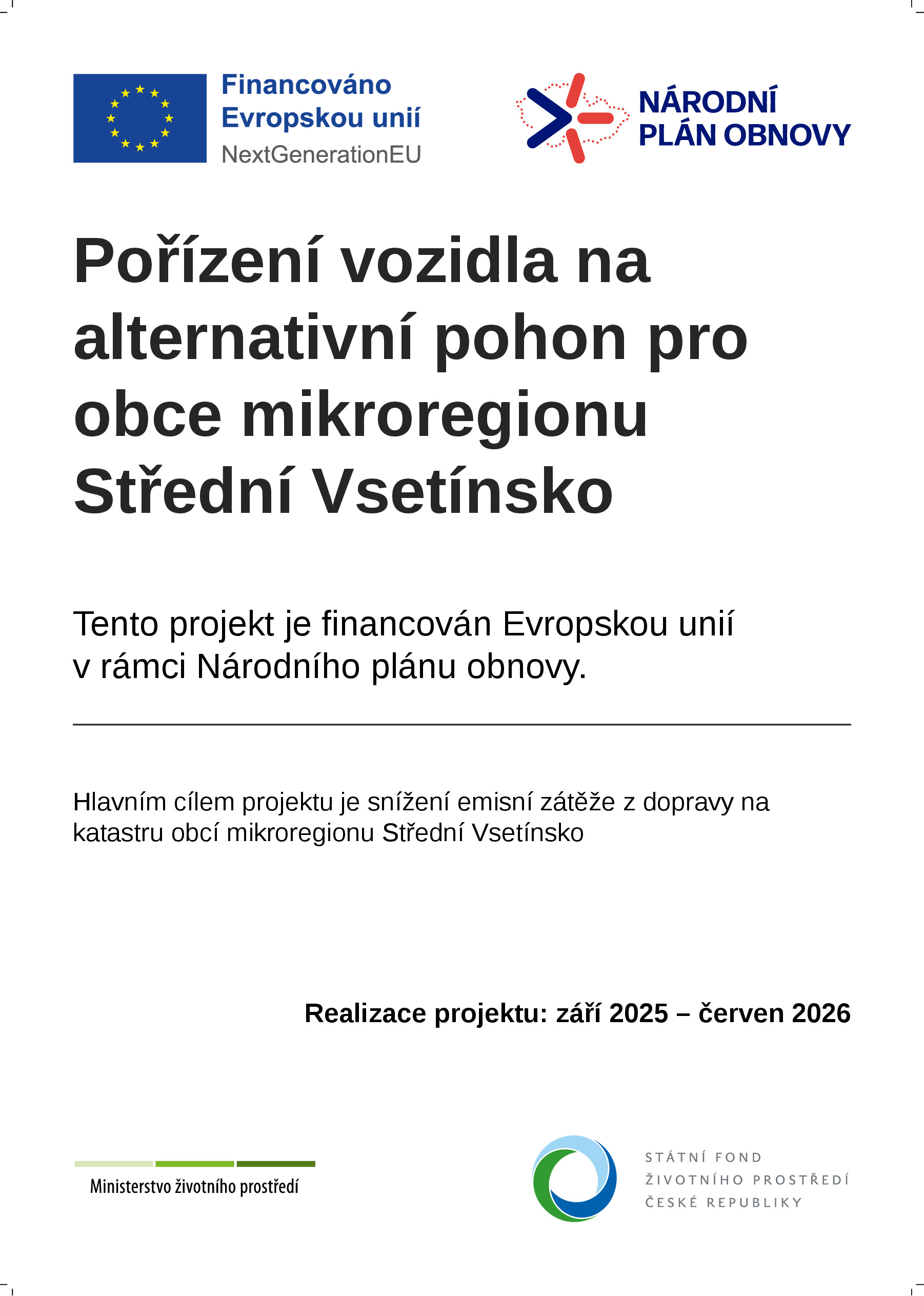 Projekt "Pořízení vozidla na alternativní pohon pro obce mikroregionu Střední Vsetínsko"je realizován s finanční podporou Evropské unie v rámci Národního plánu obnovy. Cílem projektu je podpora udržitelné mobility a snížení negativních dopadů dopravy na životní prostředí v obcích mikroregionu.